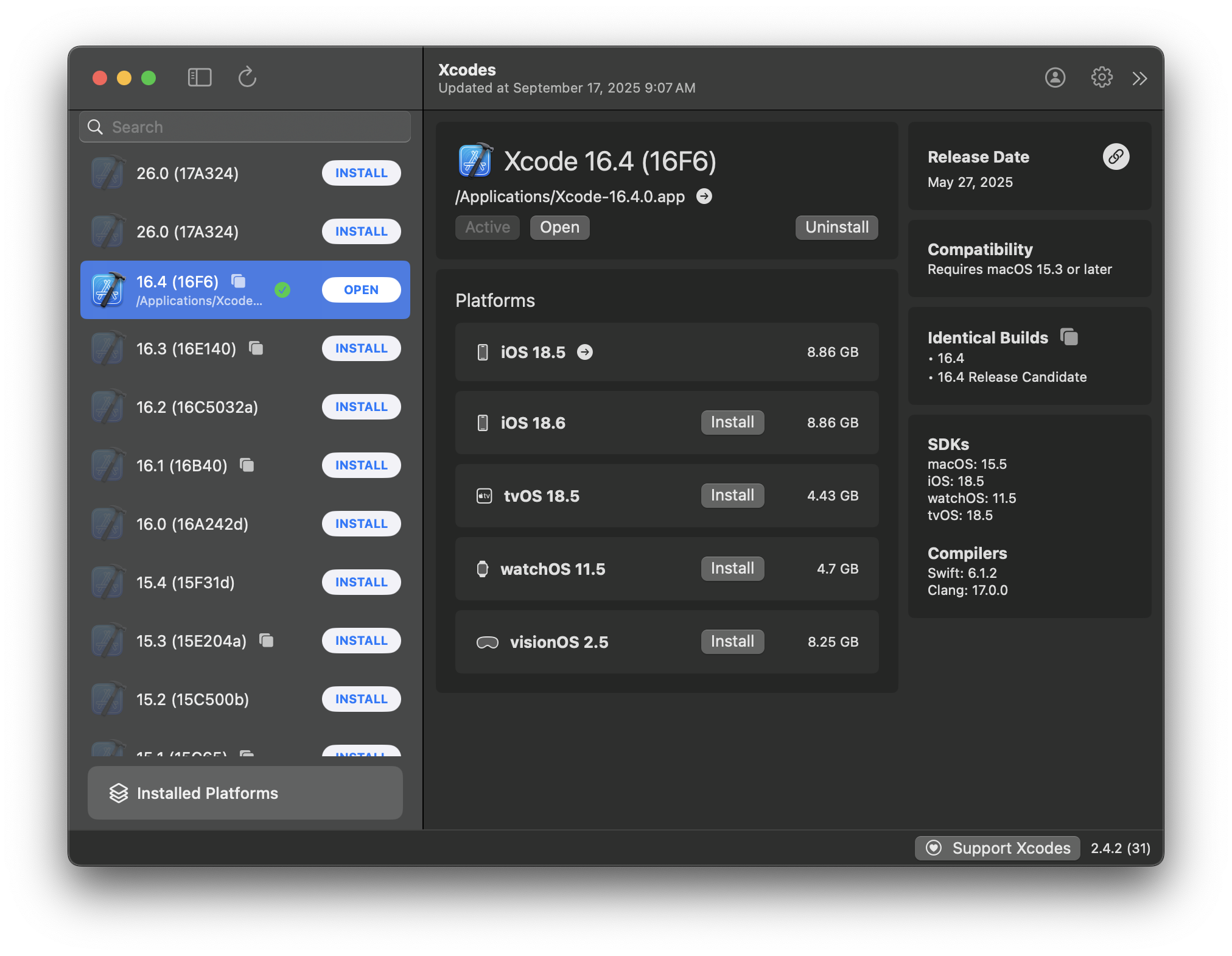 Below you can see that when I took this screenshot I had 16.4 installed, with Xcode 26 available.